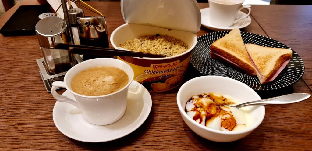 11.30am – 因为闺蜜肚子饿,我们先去餐厅吃早餐。我们点了火腿三明治、半生熟鸡蛋、鲍鱼鸡汤面还有咖啡。
