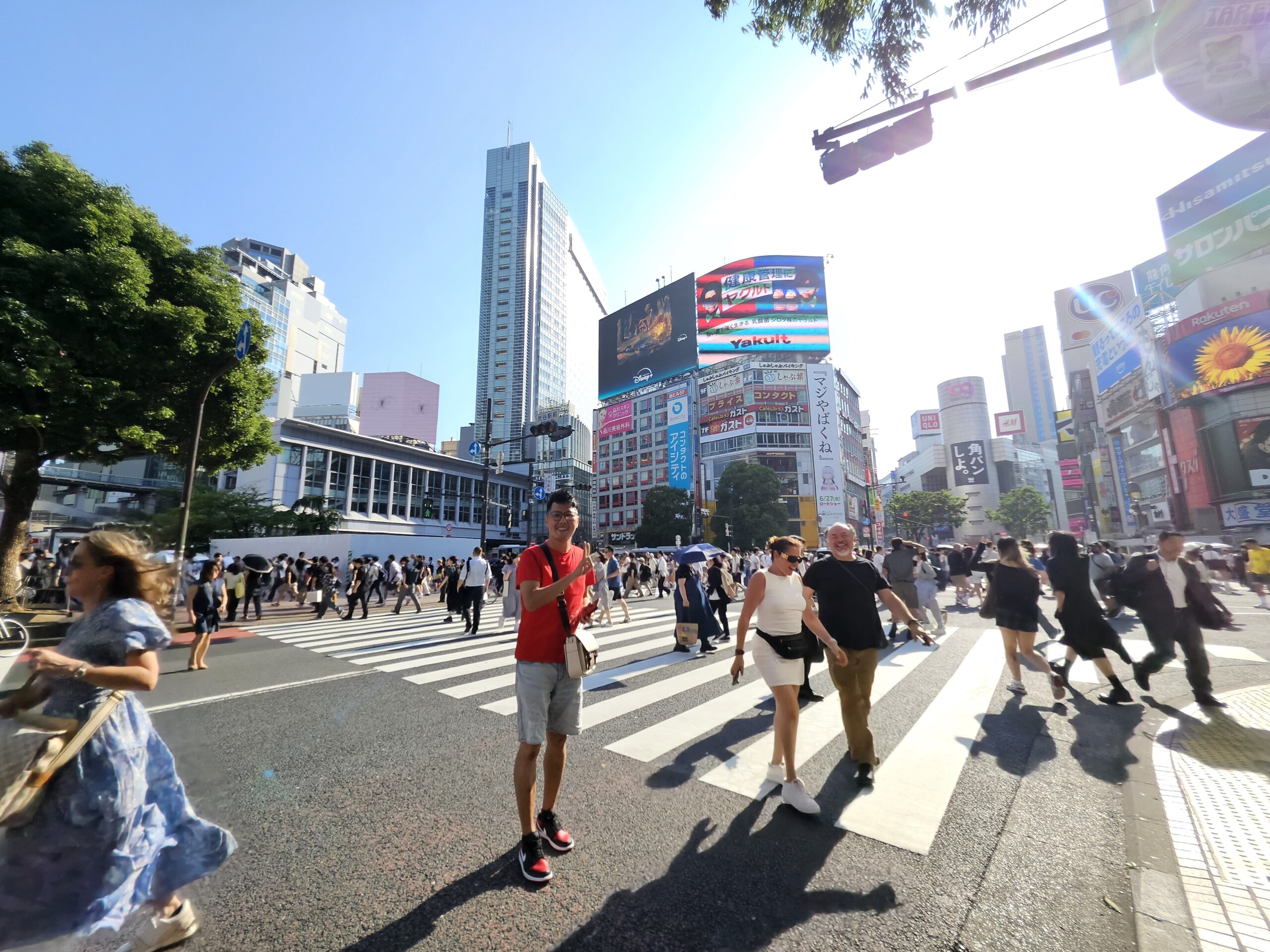 涩谷十字路口真的超夸张!每次红灯一变,几百人一起从四面八方过马路,看起来像电影画面一样。