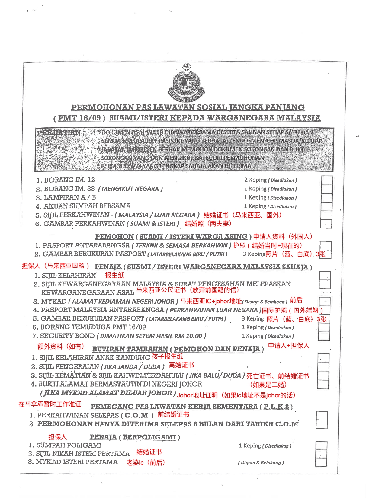 1. 文件清单:Permohonan Pas Lawatan Sosial Jangka Panjang (PMT 16/09) Suami Isteri Kepada Warganegara Malaysia
