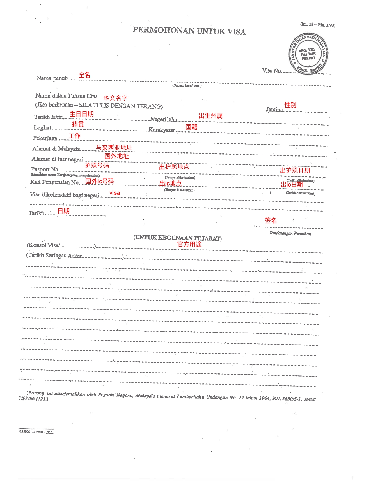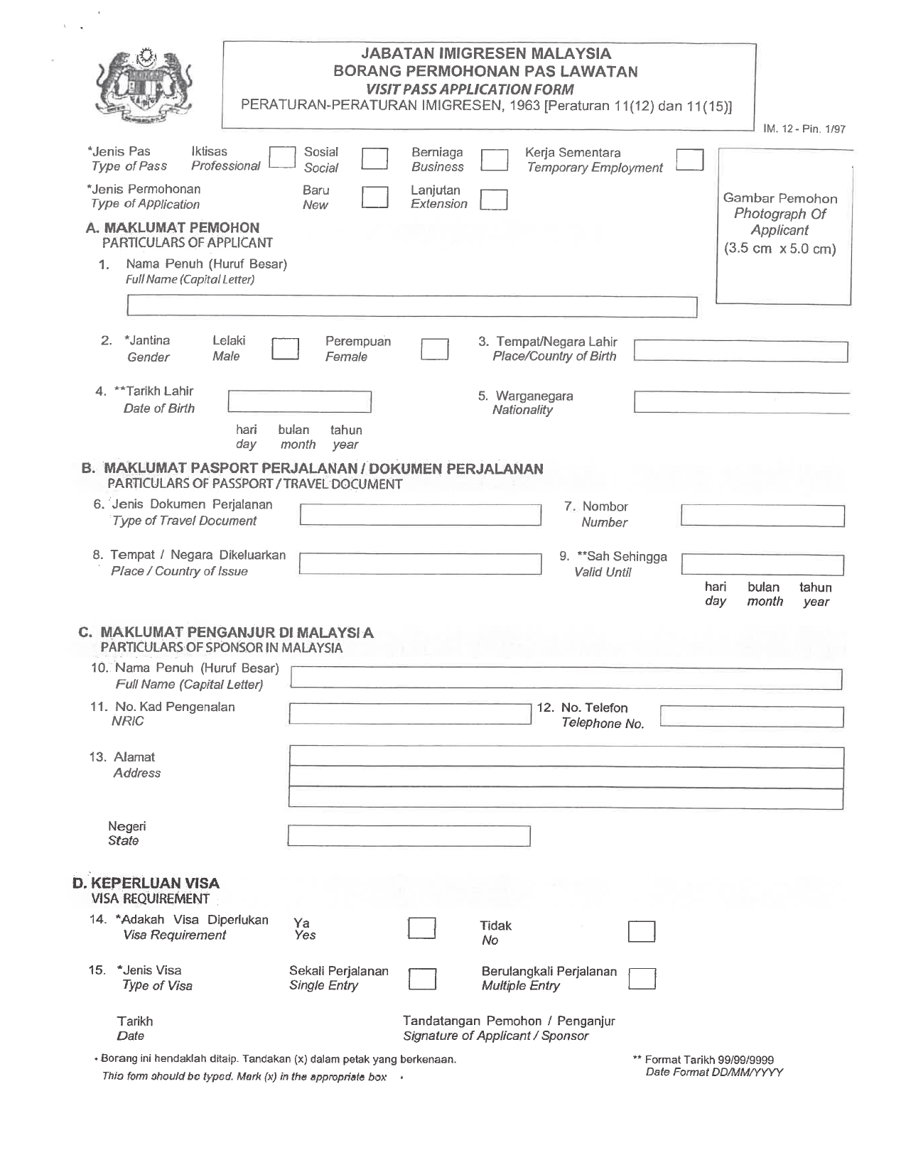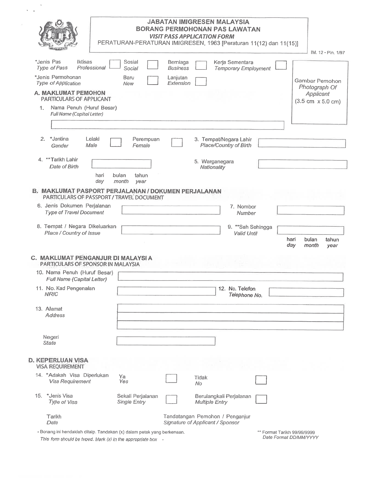 2. 表格:Visit Pass Application Form (IM. 12 – Pin. 1/97) 【注意:这个表格必须填2份!】