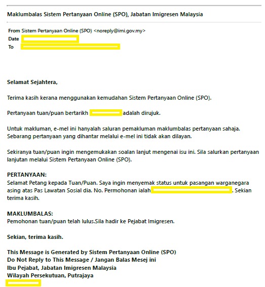 Selamat Petang kepada Tuan/Puan. Saya ingin menyemak status untuk pasangan warganegara asing atas Pas Lawatan Sosial dia.